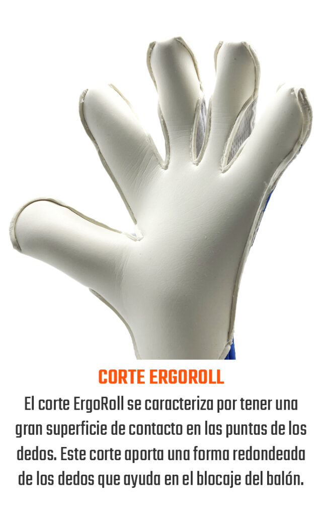 Gran superficie de contacto redondeada para abarcar más balón. FINGERTIP en las puntas de los dedos. Capa de textil Mesh entre los dedos para una mayor adaptación y ventilación. Guante montado en corte Ergoroll con envoltura de látex en el pulgar.