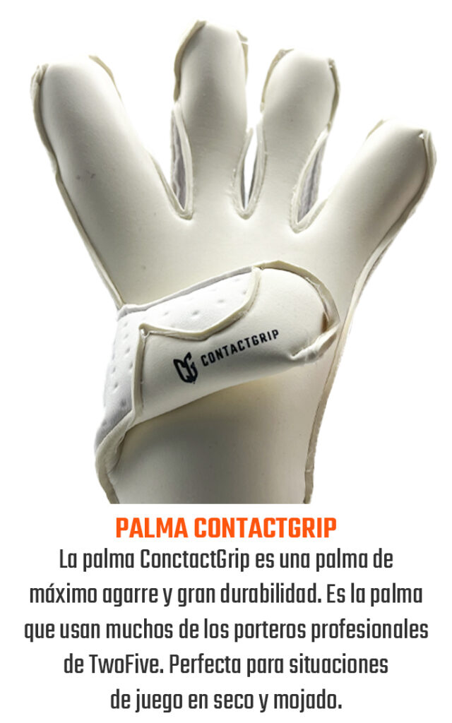 Palma de máximo rendimiento suministrada a nuestros porteros patrocinados para competir en ligas profesionales. Palma de competición con el mejor agarre en cualquier condición climática. 3.5mm látex German ContactGrip + 4mm foam. Sensación de agarre firme. Gel interno Anti-Slip para aumentar el tacto con el balón y limitar los micro-movimientos de la mano dentro del guante.