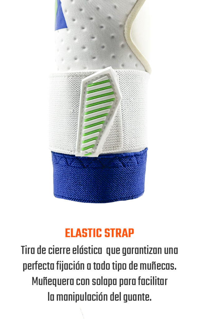 Tira elástica opcional con dos puntos de anclaje. Muñequera elástica que se ajusta perfectamente al contorno de la muñeca. Incluye tira de cierre de vuelta completa, opcional para los porteros que deseen mayor ajuste.
