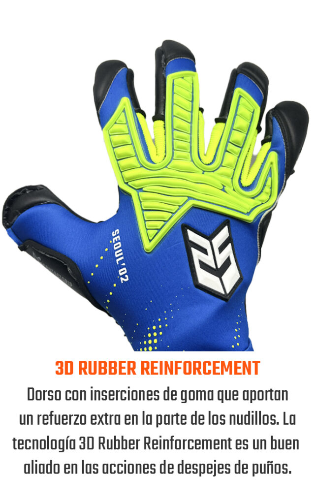 Dorso reforzado en las zonas de impacto Incrustaciones de goma situadas estratégicamente en el dorso para mitigar el impacto y potenciar los despejes de puños. Dorso de neopreno que se ajusta a la mano como una segunda piel.
